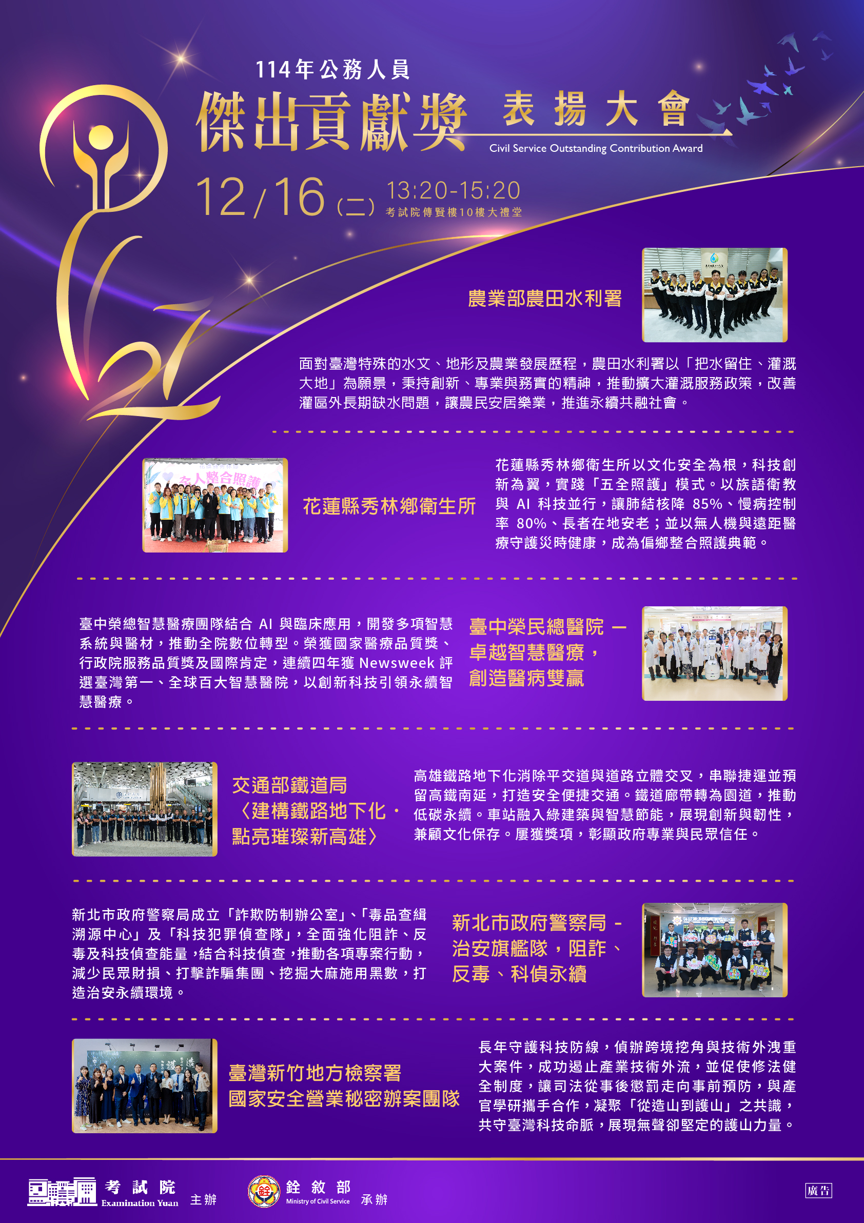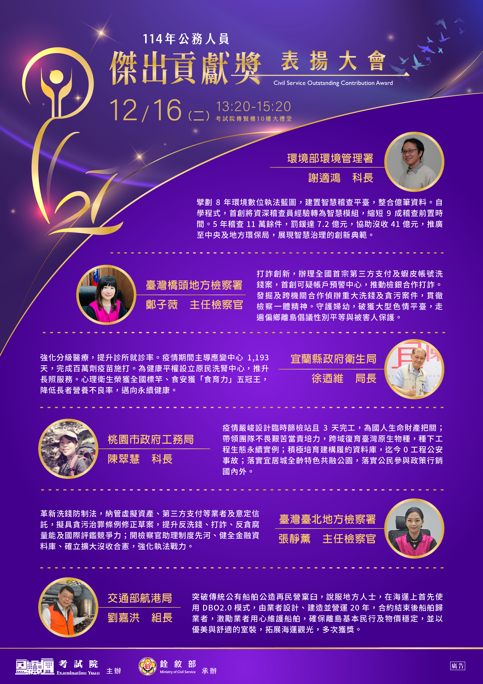 | 2025-11-28 | 【114年公務人員傑出貢獻獎】 【表揚大會】 考試院訂於114年12月16日(星期二)下午1時20分於該院傳賢樓10樓大禮堂舉行表揚大會,活動詳情請至銓敘部全球資訊網「傑出貢獻獎」最新消息項下查詢。 |